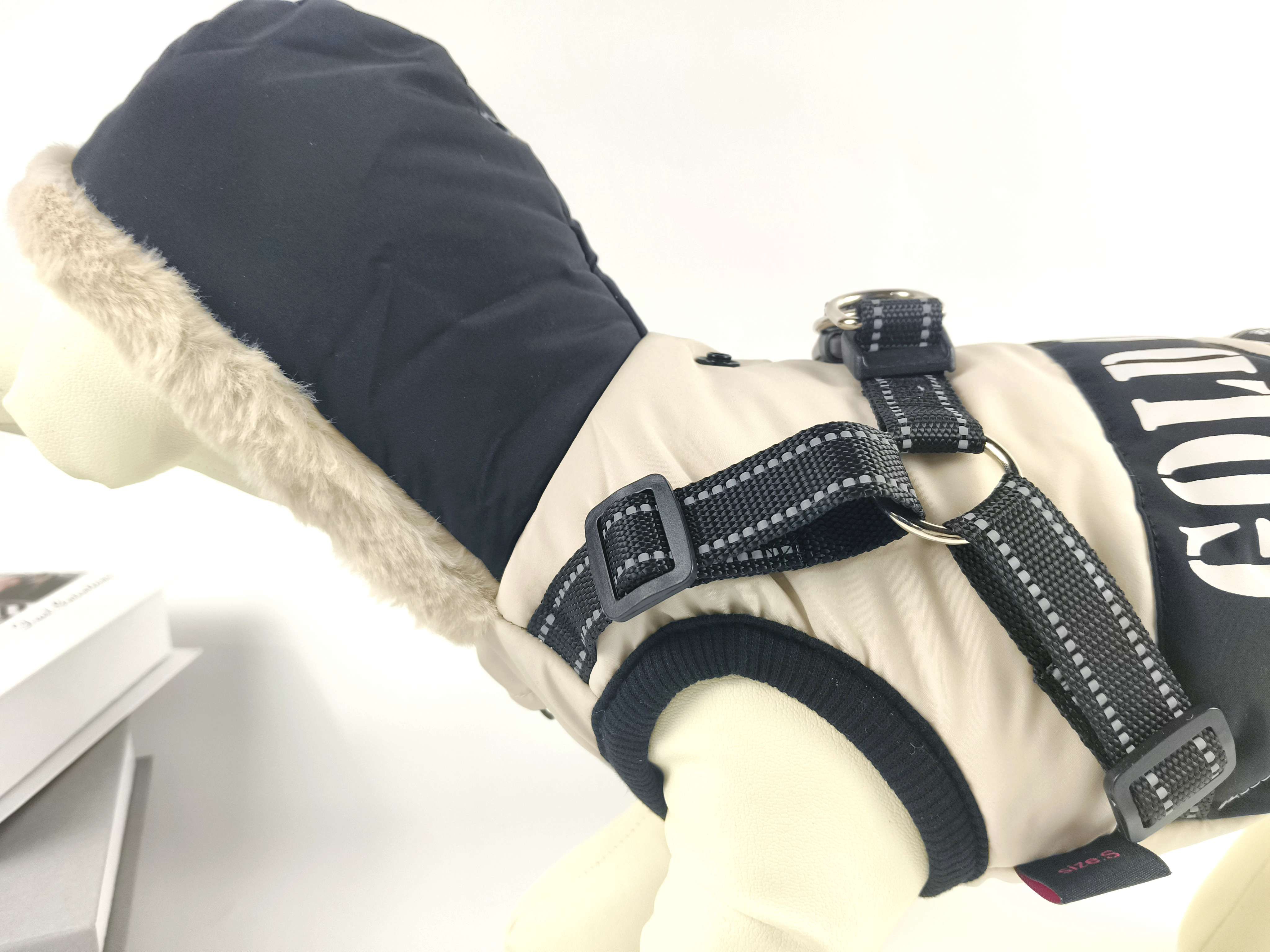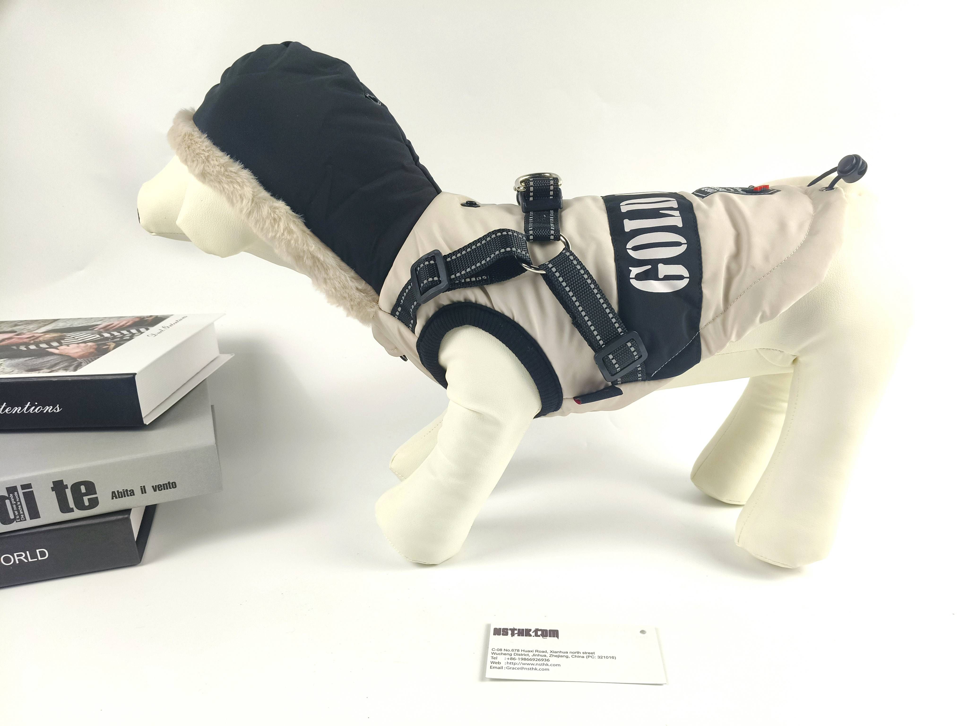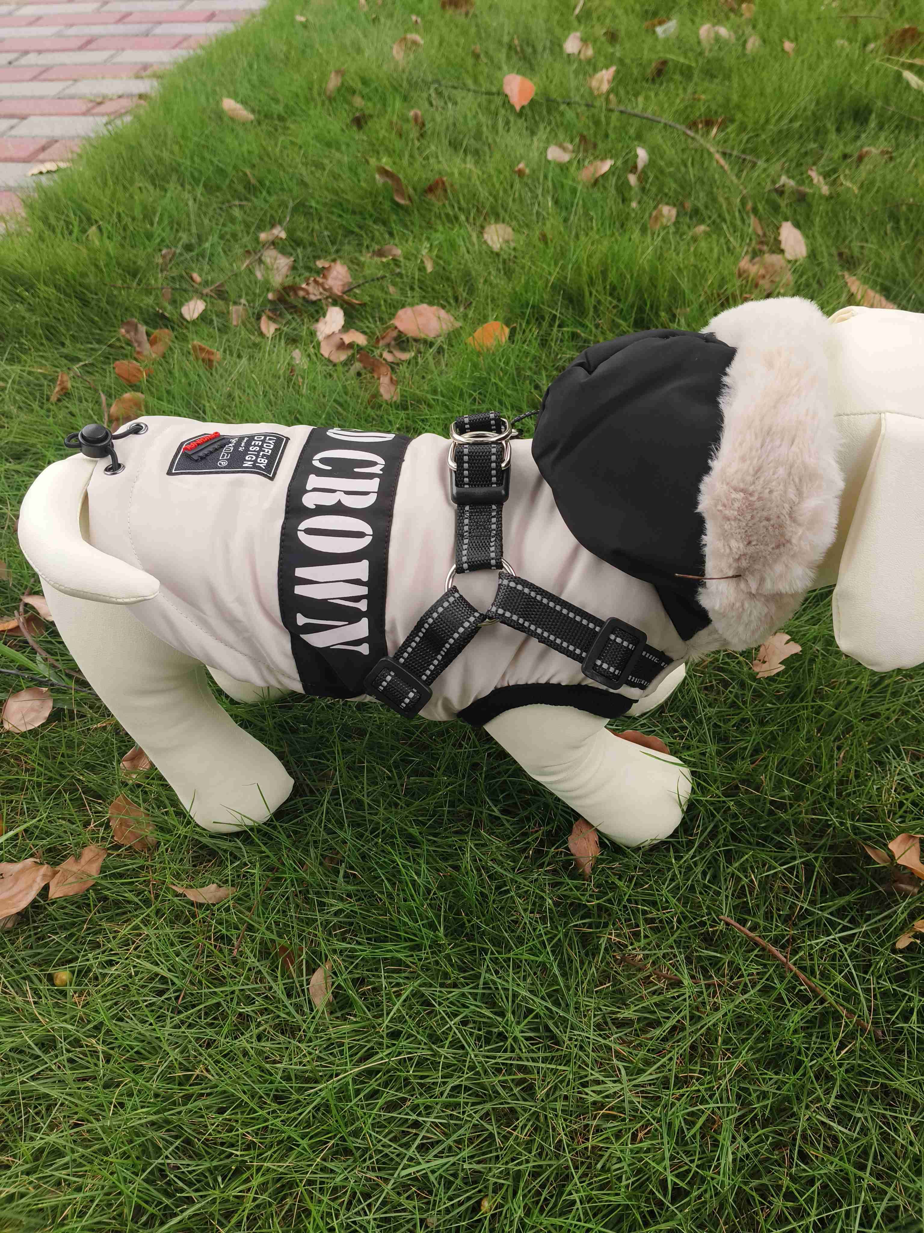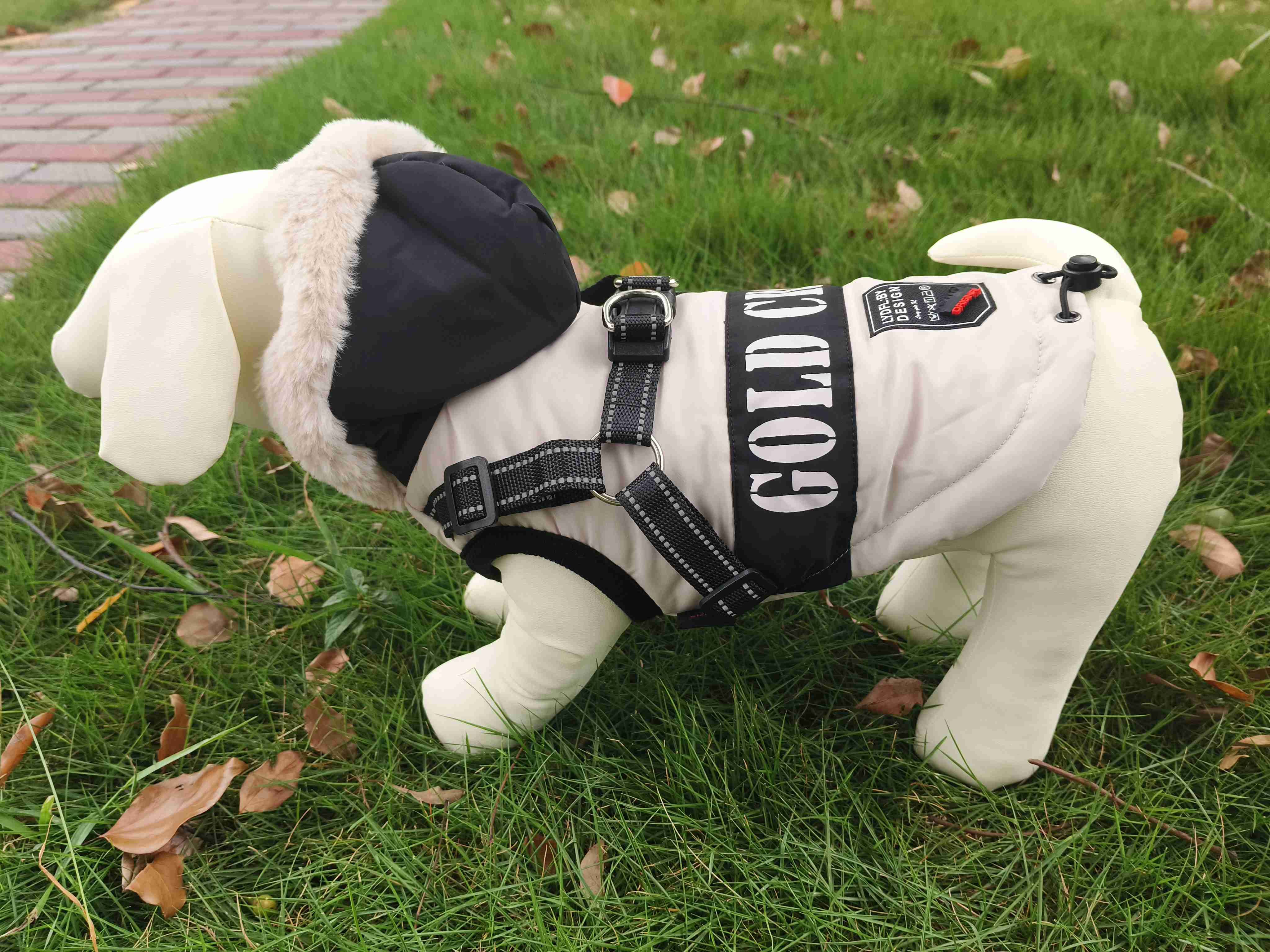 Pet clothes / Coat(F3761B-U3670) Construction:Reflective pet harness + coat Material: Waterproof coating polyester fabric Internal:silk like cotton Lining:Thermal storage graphene + Taffeta polyester Zipper:5# Resin zipper. Belt:Adjustable 2.0cm reflective webbing harness Weight:140g Size: Back length x Chest x Neck Circumference S:24X42X28CM/160g / Packing: 120pcs/50x50x50cm M:28X46X32CM/180g / Packing: 100pcs/50x50x50cm L:32X50X36CM/192g / Packing: 90pcs/50x50x50cm XL:36X54X40CM/208g / Packing: 80pcs/50x50x50cm XXL:40X58X44CM/232g / Packing: 60pcs/50x50x50cm XXXL:43X62X48CM/255g / Packing: 50pcs/50x50x50cm Packing: 1pc per polybag. Logo:1c logo printed one position. Size label: Yes Coo label:Yes