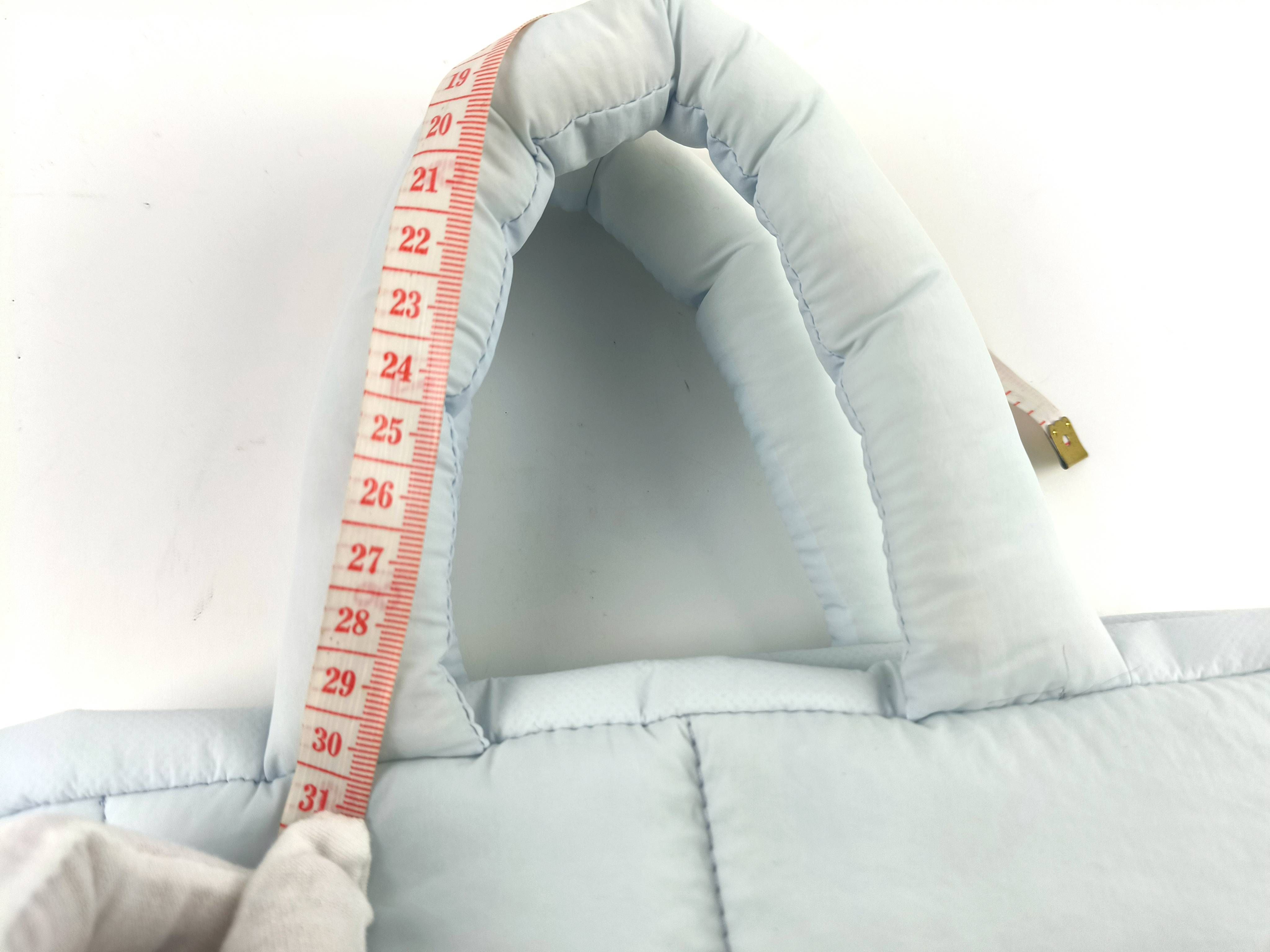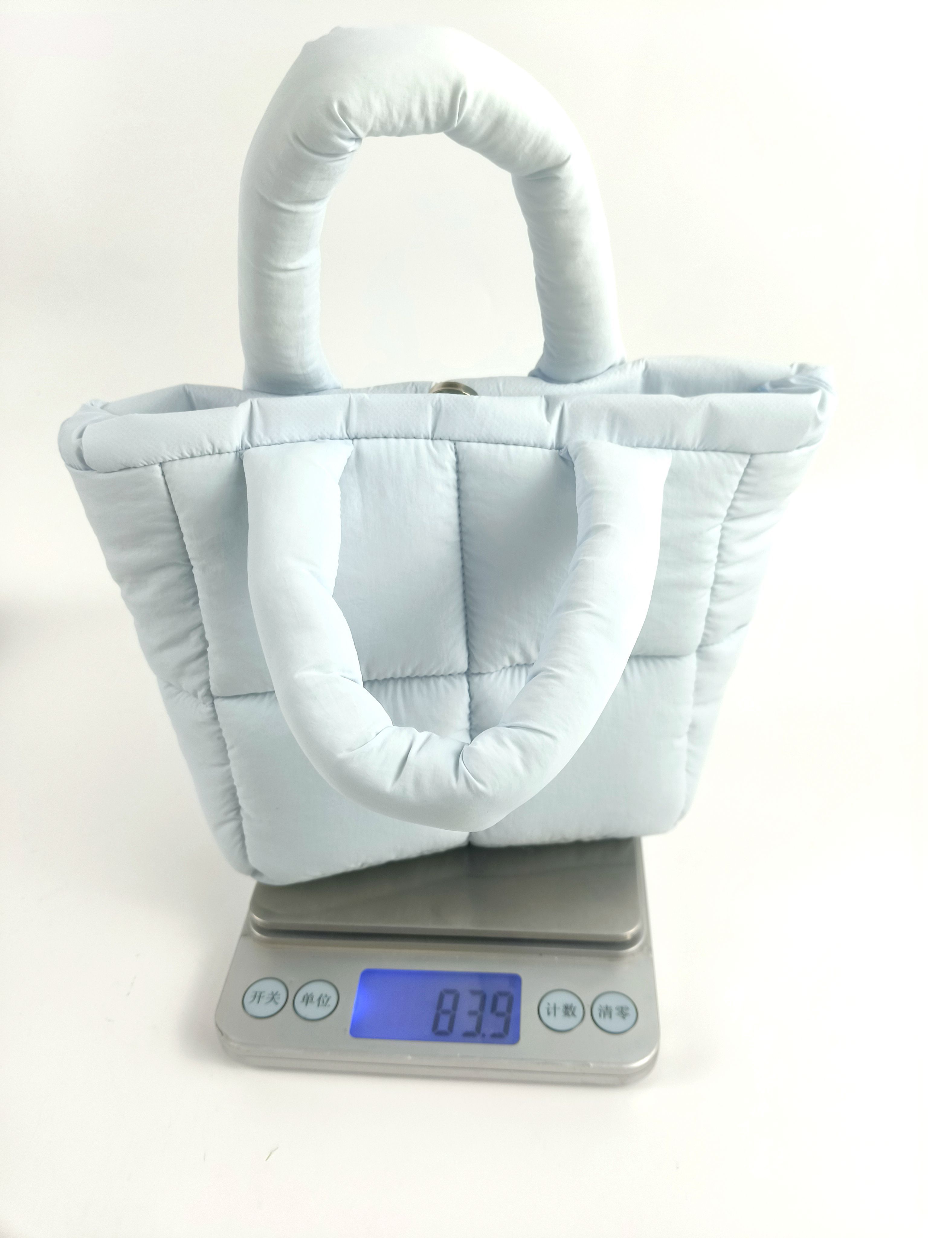 Item: RPET Quilted Tote bag(F3762B)-吴经理 Construction:T-guesst with short handle Weight:83g Material: 70% Recyled + 30% regular 40D polyester fabric Internal: 100% Recyled 300g silk like cotton( RPET Spray-bonded cotton再生仿丝棉) Lining:100% 190T RPET Clousre:1pc magnetic buckle Body material Short handle:2.5cm diemeter x 30cm Size: Top LR 25 cm x LR base 19 x FB9 x TB19 cm Logo:1C woven label sewn on side part. Inner COO label:yes. Package:Flat packed, 1 x Silica Sachet,individual tissue paper wrapped, Must not exceed more than 15kgs GW 60pcs/CTN/60X47X45cm/15kgs (rough only)