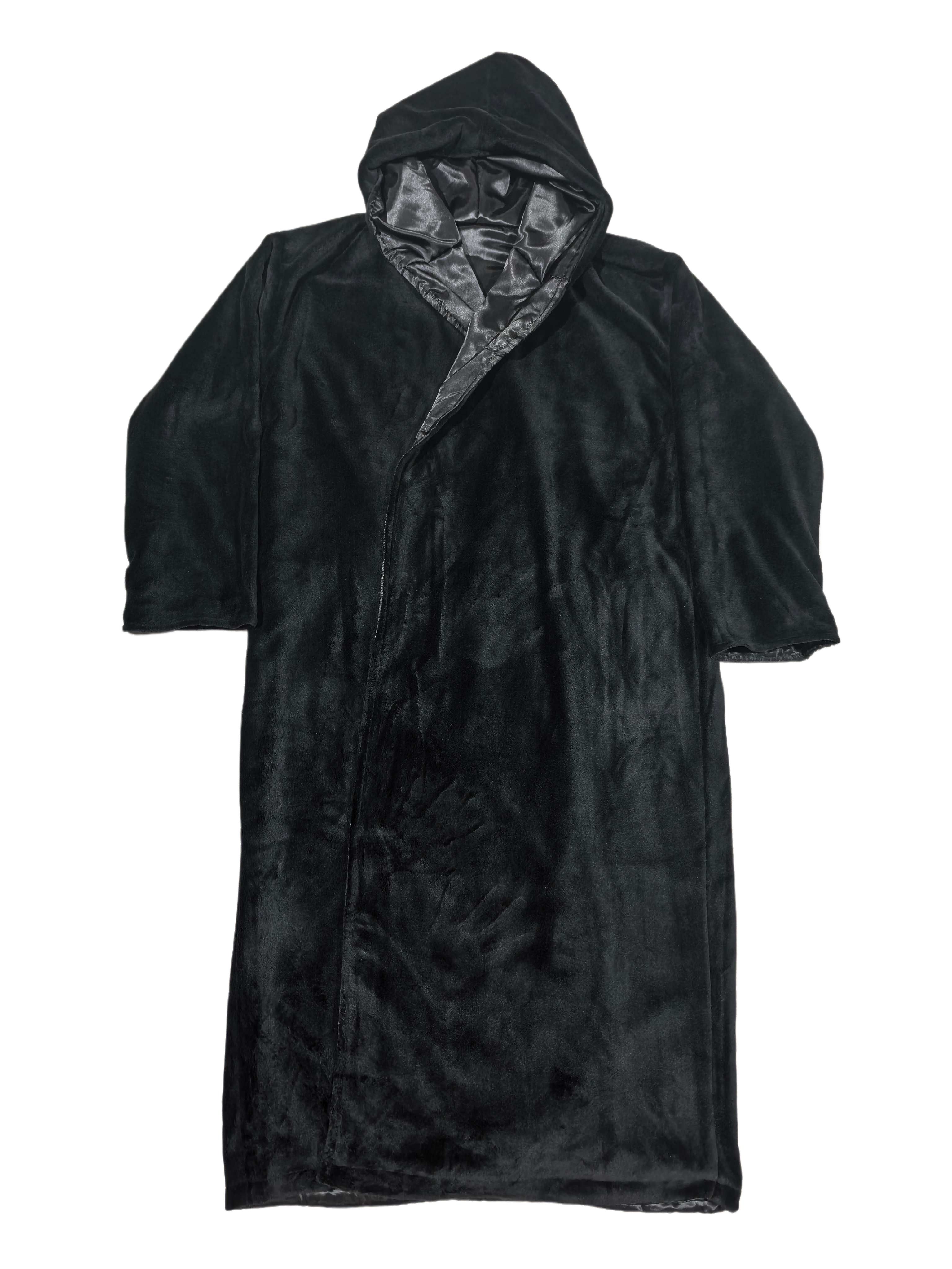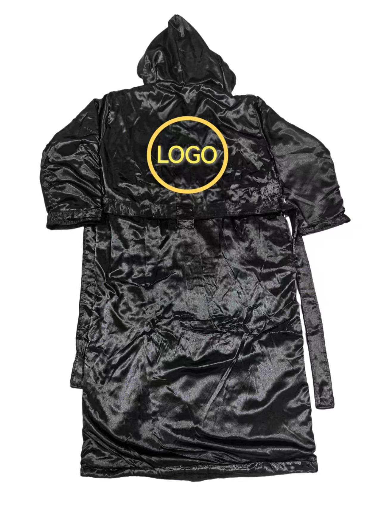 Material:Black velvet inside, Black stain outside Size: XL, Robe Length 137cm Logo: 1c embroidery on 2 positions PMS7555C Package:10pcs/CTN/60x40x50cm/15kgs (rough only)