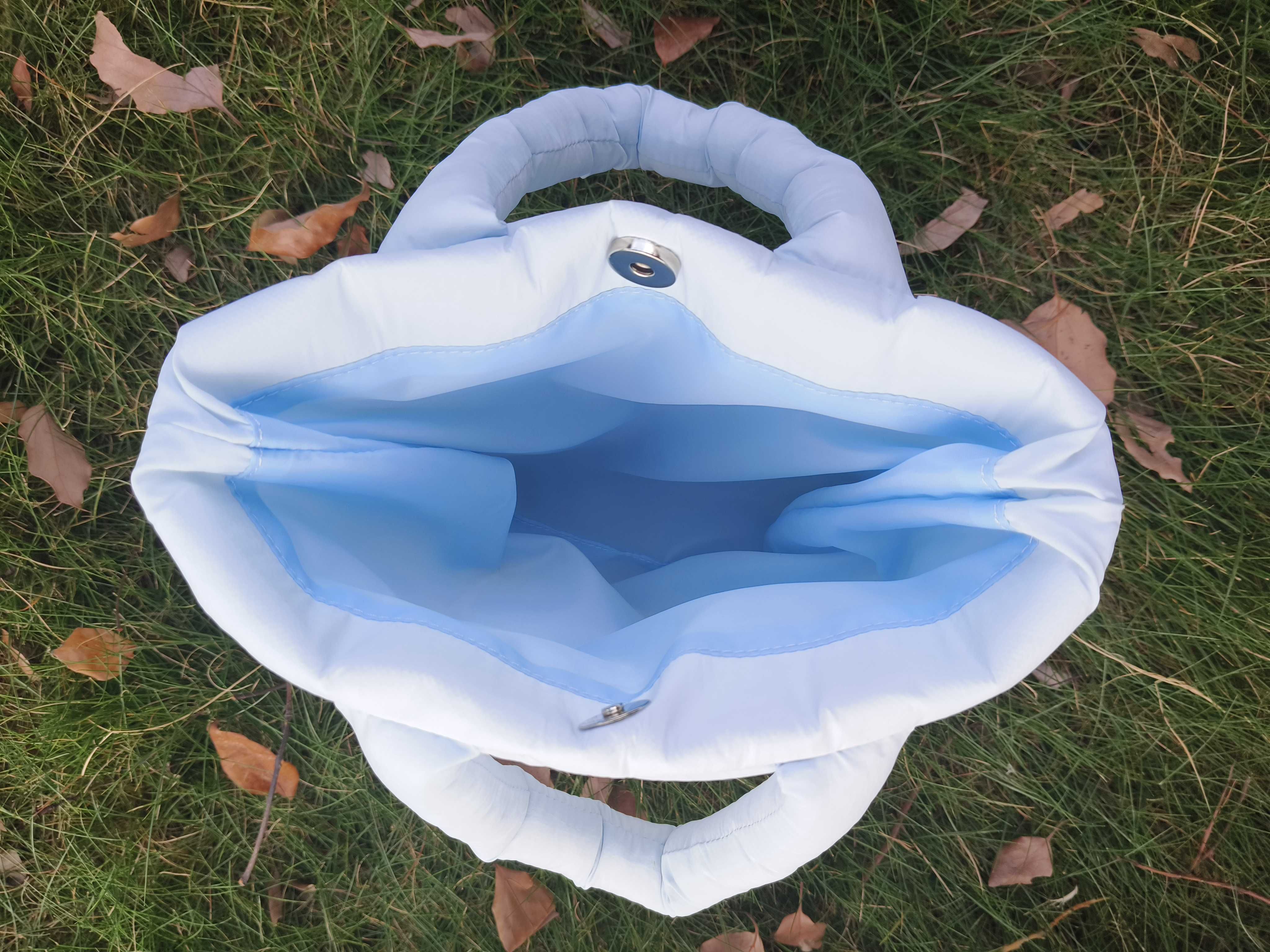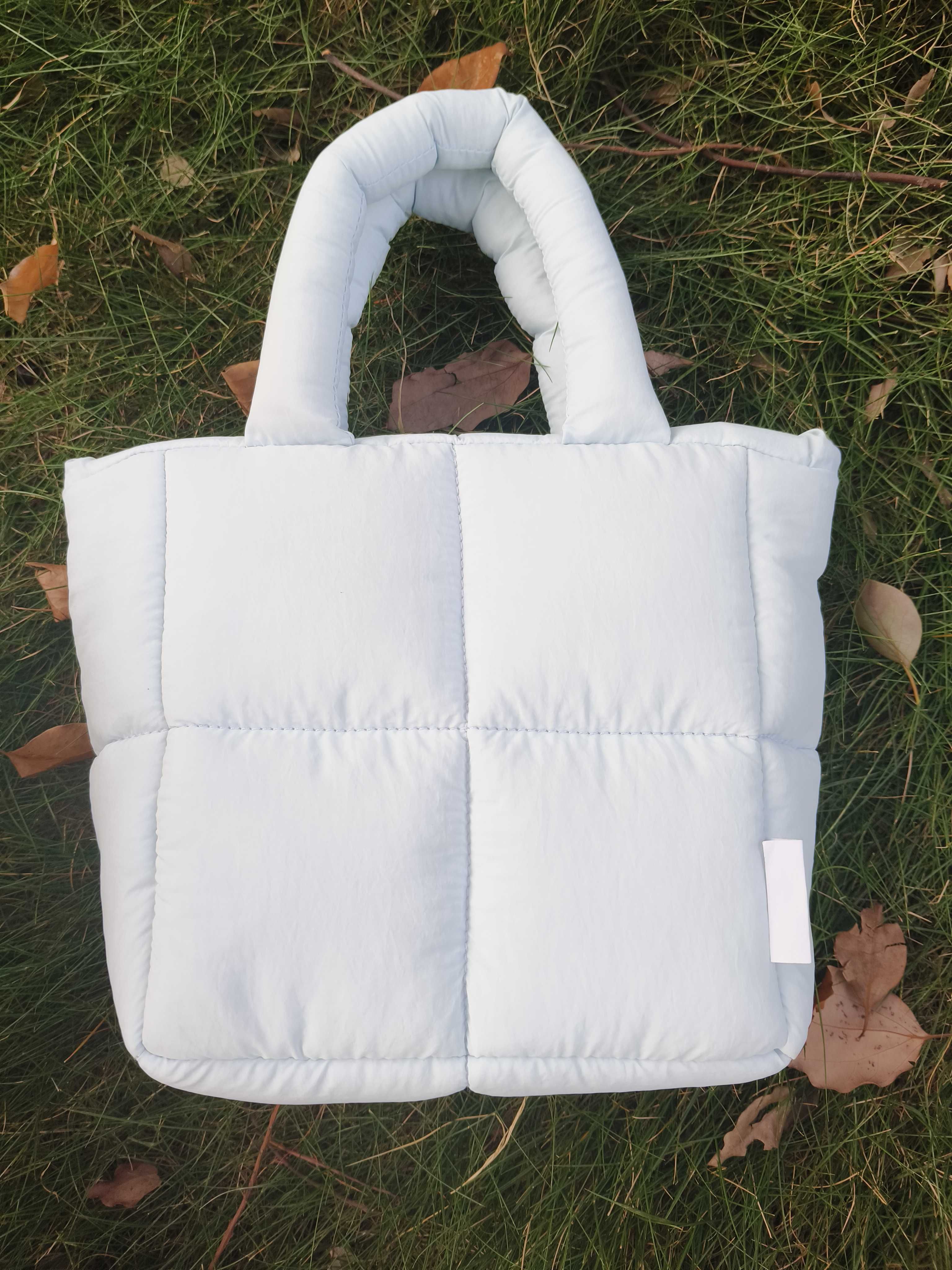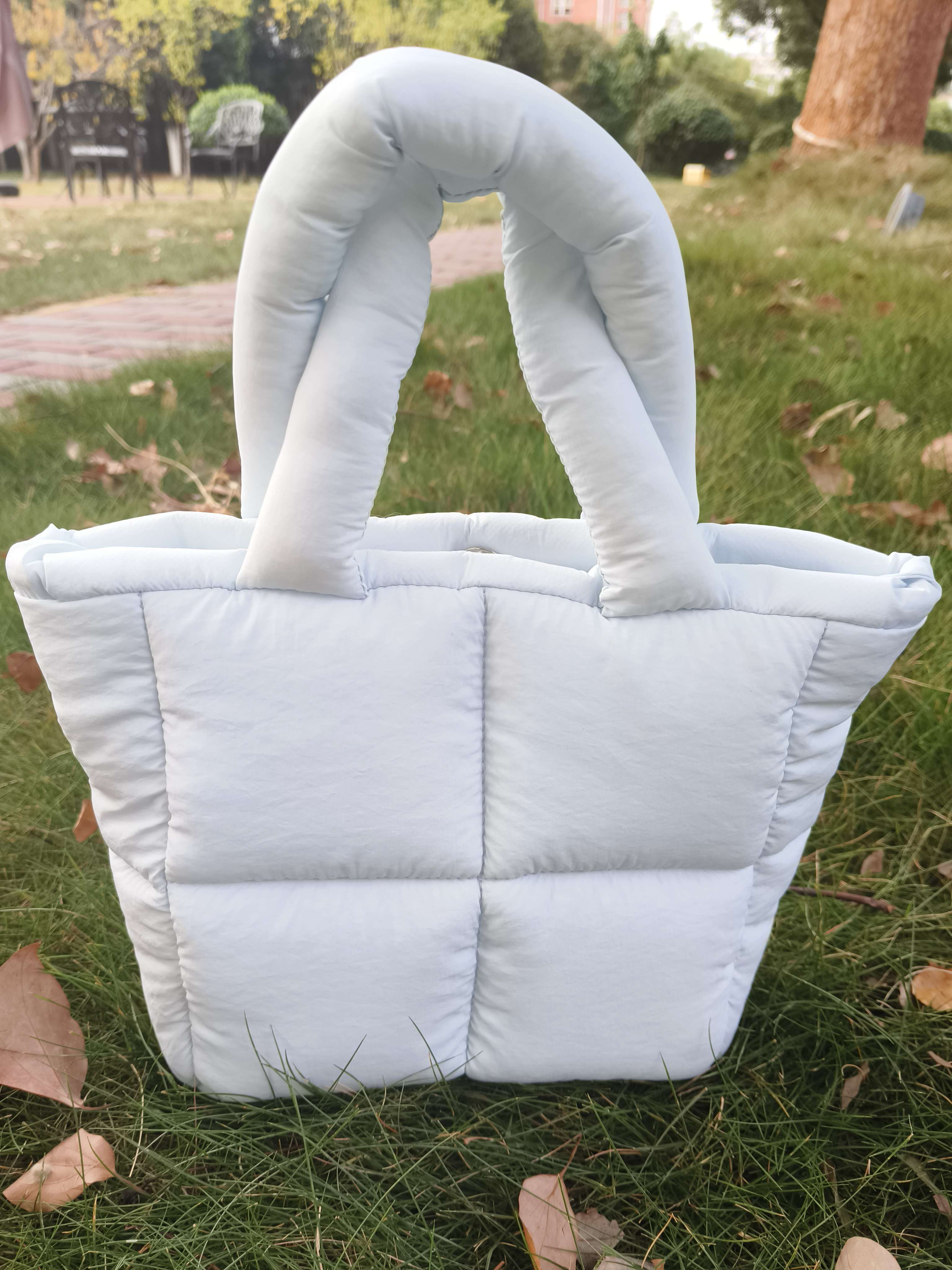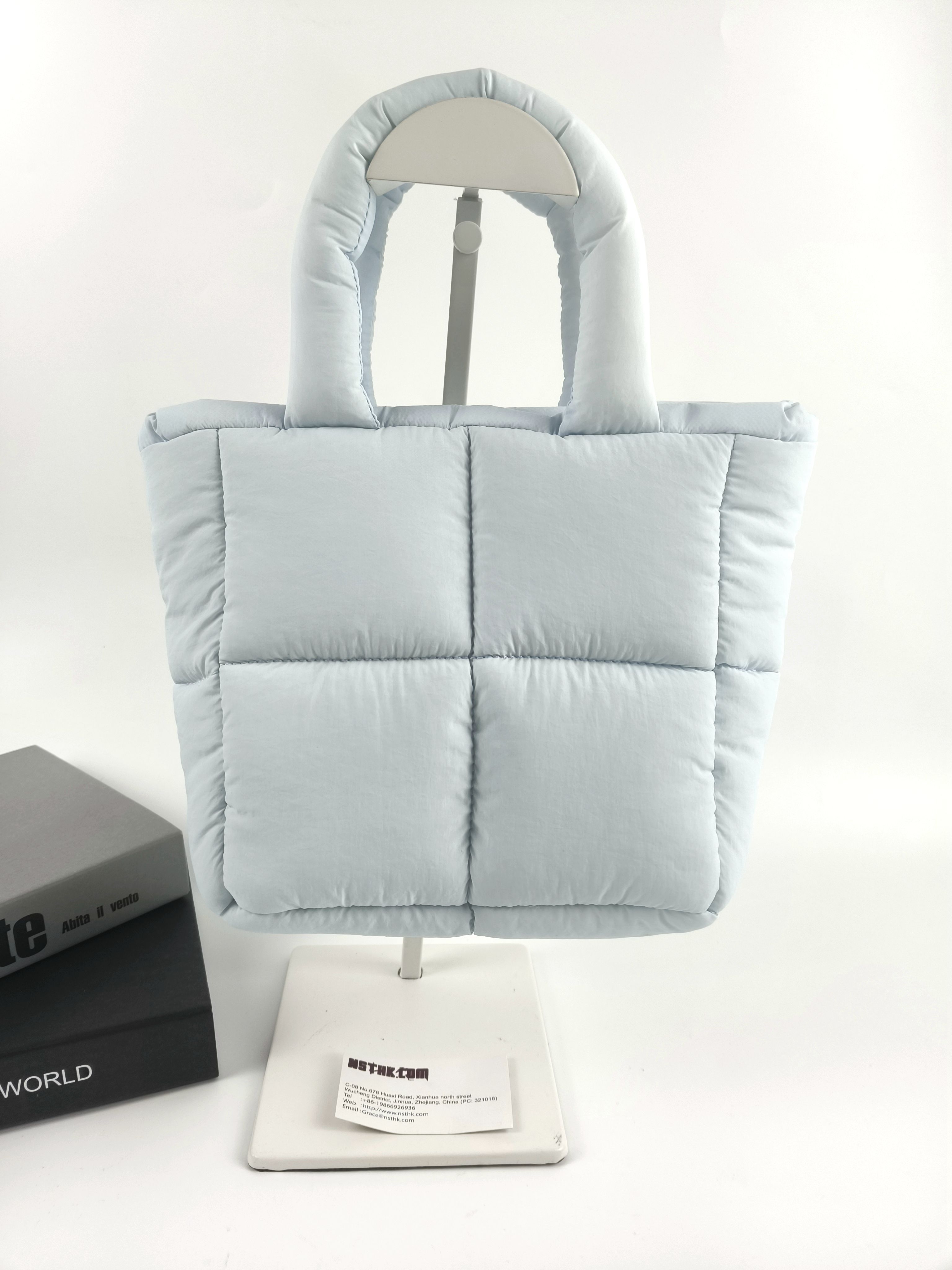 Item: RPET Quilted Tote bag(F3762B)-吴经理 Construction:T-guesst with short handle Weight:83g Material: 70% Recyled + 30% regular 40D polyester fabric Internal: 100% Recyled 300g silk like cotton( RPET Spray-bonded cotton再生仿丝棉) Lining:100% 190T RPET Clousre:1pc magnetic buckle Body material Short handle:2.5cm diemeter x 30cm Size: Top LR 25 cm x LR base 19 x FB9 x TB19 cm Logo:1C woven label sewn on side part. Inner COO label:yes. Package:Flat packed, 1 x Silica Sachet,individual tissue paper wrapped, Must not exceed more than 15kgs GW 60pcs/CTN/60X47X45cm/15kgs (rough only)